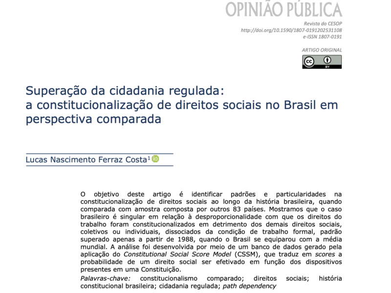 Artigo publicado na Opinião Pública pelo pesquisador Lucas Costa analisa a constitucionalização de direitos sociais e econômicos na história constitucional brasileira: no Brasil, o processo de reconhecimento constitucional de direitos privilegiou direitos do trabalho em prejuízo aos direitos universais, tendência superada apenas em 1988. Este processo está alinhado com a ideia de cidadania regulada, proposta originalmente por Wanderley Guilherme dos Santos, segunda a qual os direitos no Brasil (não apenas os sociais e econômicos, mesmo os civis e políticos), seriam, por grande parte do século XX (entre as décadas de 1930 e 1980), indissociáveis da condição de trabalhador, concebida e regulada pelo Estado. Ou seja, apenas era cidadãos, e gozavam dos direitos associados a essa condição, os trabalhadores formais, assim reconhecidos pelo Estado.